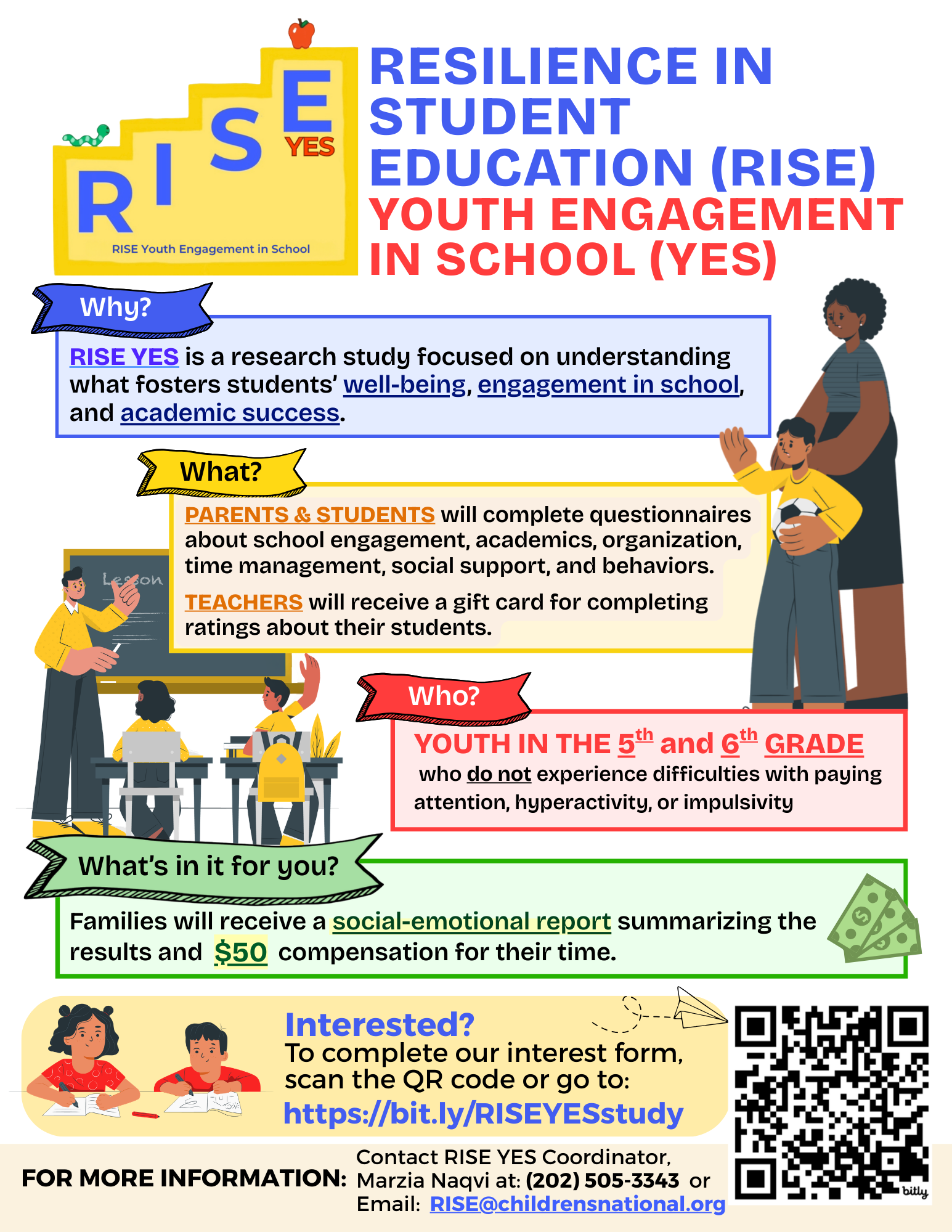 The RISE YES study is designed to learn more about school engagement and factors that promote academic success and healthy social emotional outcomes across the transition from fifth grade to middle school for girls and boys.